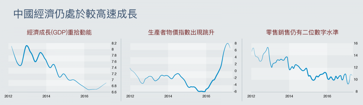 雖然 10% 的經濟成長率已不復見,但與成熟市場相比,中國今年首季 6.9% 的 GDP 成長仍然偏高。與企業獲利相關的生產者物價指數 (PPI),在連續54 個月的負成長後,已在去年9月出現翻揚;零售銷售維持在 10% 左右的高成長,線上零售成長更在 30% 以上。同時,通膨則處於偏低